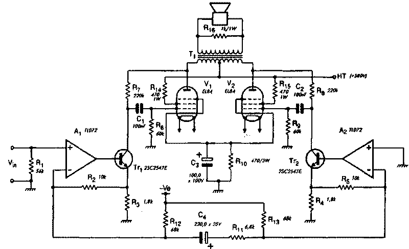 Оптимальным путем снижения выходного сопротивления ламп является применение в каскаде параллельной отрицательной обратной связи по напряжению, образующей источник напряжения, управляемый током (в отечественной литературе используется аббревиатура ИНУТ — ред.), а в качестве источника сигнала для него целесообразно применять эффективный в этом режиме транзисторный каскад в виде источника тока, управляемого напряжением (ИТУН). Таким устройством является каскад на транзисторе (Tri, Tr2), управляемый операционным усилителем (A1, А2) с охватом их общей последовательной обратной связью по току. В результате без общей обратной связи получена высокая линейность и значительно снижено выходное сопротивление ламп: приведенное к вторичной обмотке, оно составляет 0,6 Ом! Противофазность управления двухтактного лампового каскада достигается использованием сигнала обратной связи для возбуждения другого плеча усилителя, выполненного с инверсией фазы сигнала.