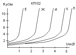 Зависимость сопротивления канала от напряжения затвора для транзистора типа КП102: