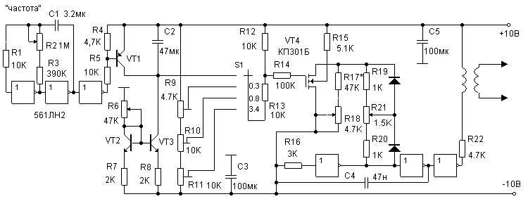 Простой генератор качающейся частоты (от 300Гц до 3.4кГц):