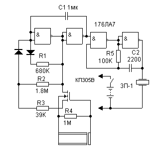 Вдали от токоведущих частей он издаёт короткий звуковой сигнал частотой около 3кГц и периодом следования около 2 с, длительность которого определяется элементами R1, R2, C1. По мере приближения к токоведущим частям частота следования звуковых сигналов повышается. В качестве датчика использован конденсатор в виде кружка из двустороннего стеклотекстолита, одна обкладка которого припаяна к гильзе — корпусу и подключена к подложке ПТ, а вторая — к затвору.