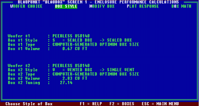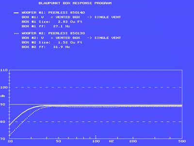 На примере видно, что я сравниваю закрытый язщик и простой фазоинвертор для одной и той же головки Peerless 850140, которую я заранее ввeл в базу. С таким же успехом я могу посмотреть как будут себя вести разные головки в одинаковом аккустическом оформлении и выбрать наиболее эффективную.