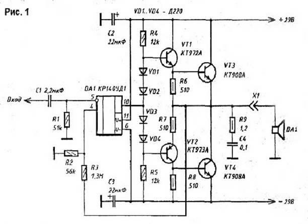 Для устранения искажений типа «ступенька» на базы VT1 и VT2 подано небольшое напряжение смещения, создаваемое по цепочке диодов VD1 …VD4. Цепь R9C4 предотвращает самовозбуждение усилителя на высших звуковых частотах и при отключении нагрузки. Для этой же цели установлены конденсаторы С2, СЗ которые необходимо разместить вблизи микросхемы DA1.
