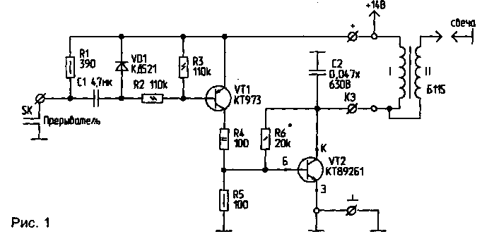 При замыкании и размыкании контактов прерывателя SKимпульс проходит через С1, кратковременно открывая VT1 и VT2. При закрывании VT2 возникает искра. С2 сглаживает пик импульса напряжения. R6 и R5 ограничивают максимальное напряжение на коллекторе VT2. При достижении нужного напряжения VT2 приоткрывается, ограничивая дальнейший рост напряжения.
