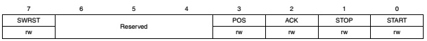 - POS– этот бит устанавливается только в случае, когда нужно принять два байта (N=2). Он должен быть установлен до начала приема данных. В этом случае импульс NACKсформируется после приема второго байта, и ACK можно сразу же сбросить сразу после отправки адреса.