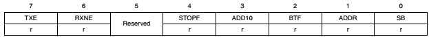 - BTF– устанавливается когда в приемный регистр DR поступил байт, но не был прочитан, и уже пришел новый байт в сдвиговый регистр