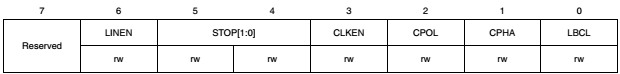 Здесь включается режим LIN и настраивается сигнал синхронизации CLK, если используется синхронный режим передачи. В данном регистре нас интересует только поле STOP. Здесь задается количество стоповых битов.