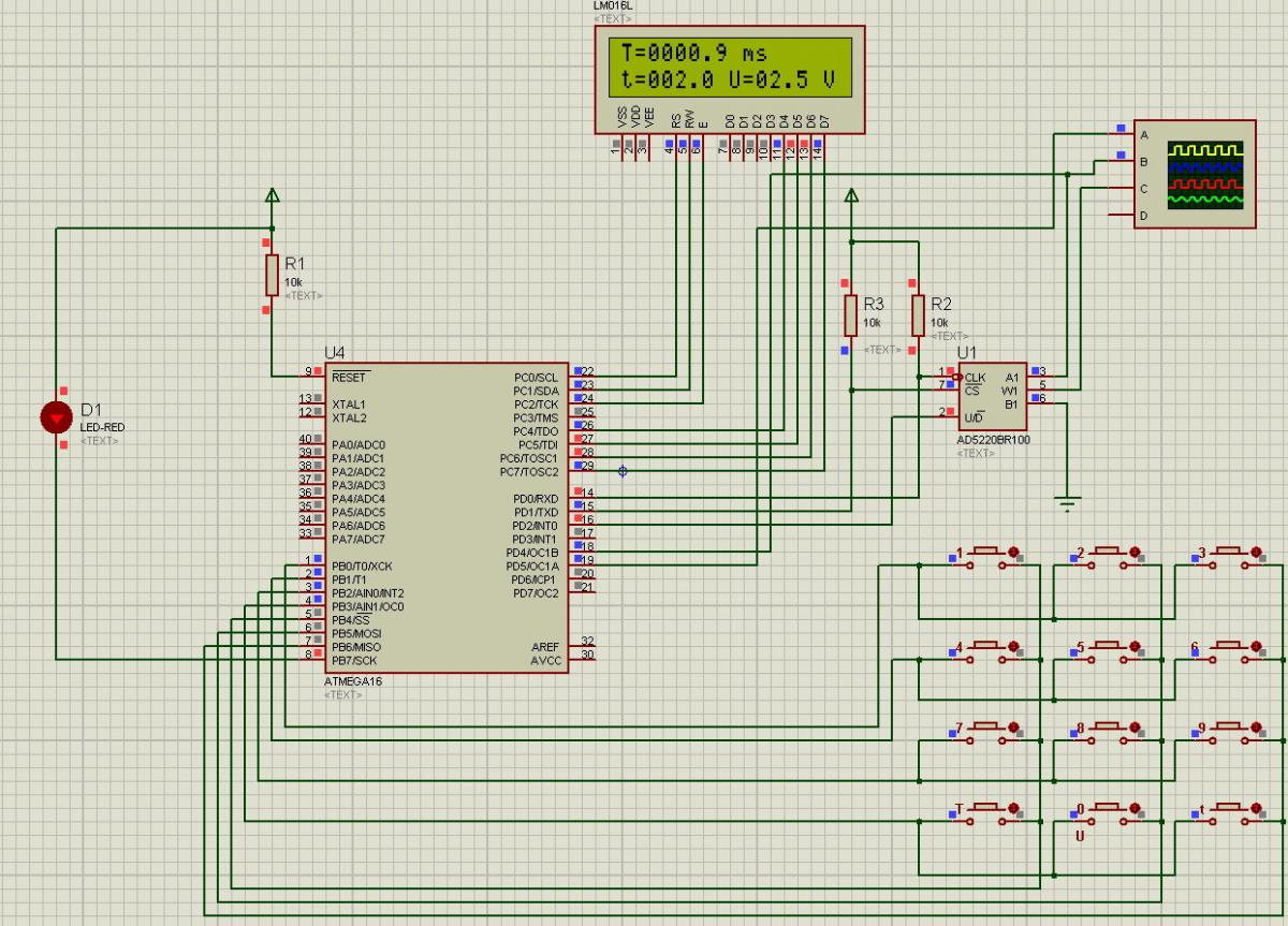 Разработать схему и программу генератора прямоугольных импульсов с возможностью регулировки выходной амплитуды сигнала от 0 В до 5 В, периода сигнала от 1 с до 1 мс и скважности сигнала. Задание значения скважности, амплитуды и периода осуществляется с помощью клавиатуры (матрицы кнопок), информация об этих величинах должна выводиться на дисплей 16х2.